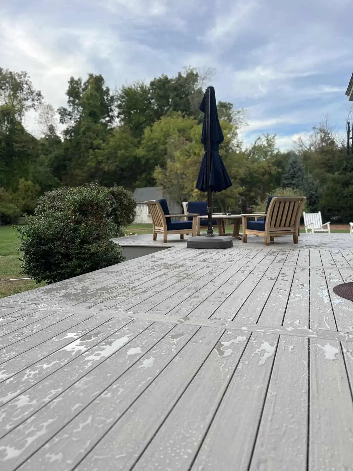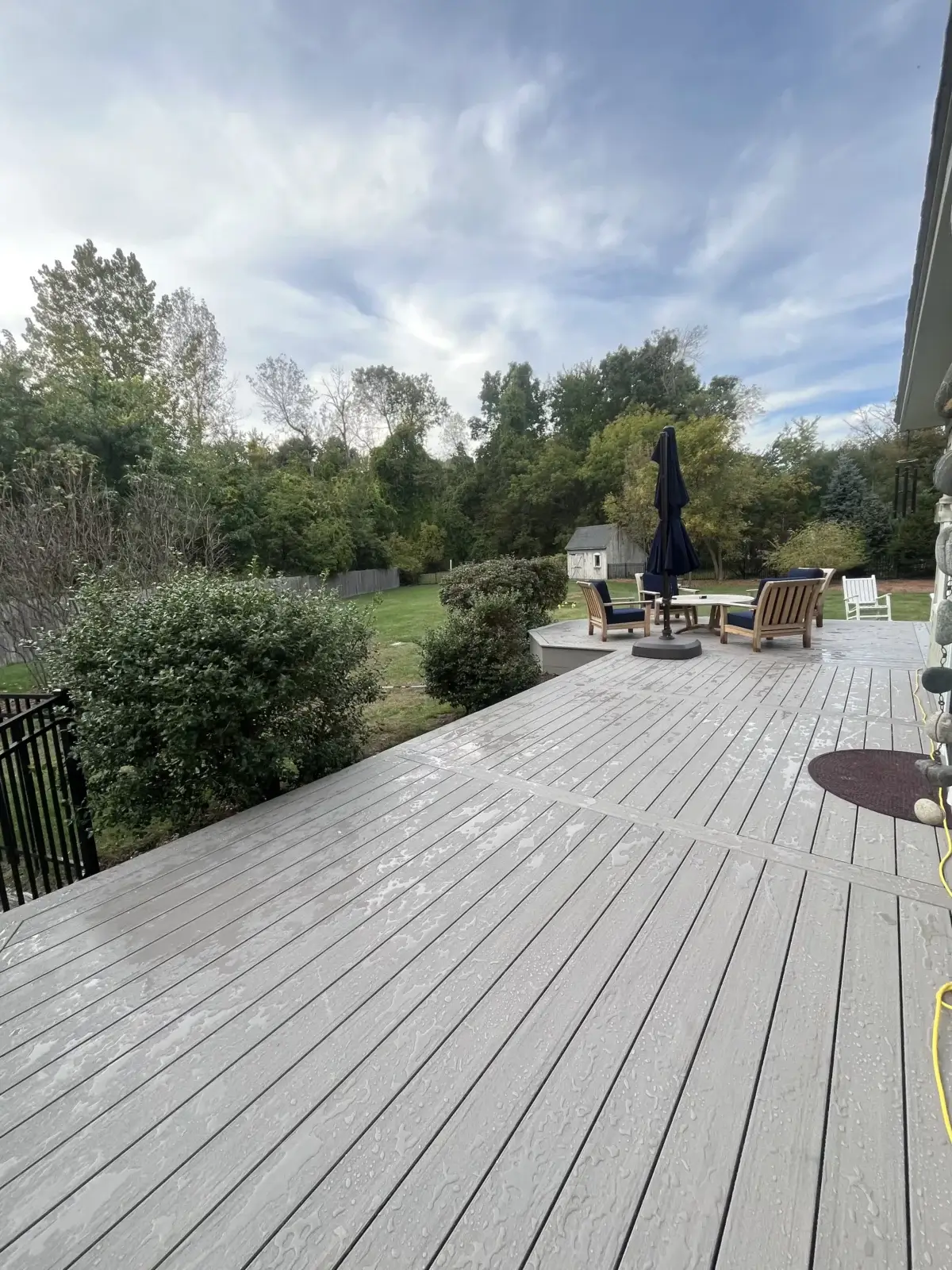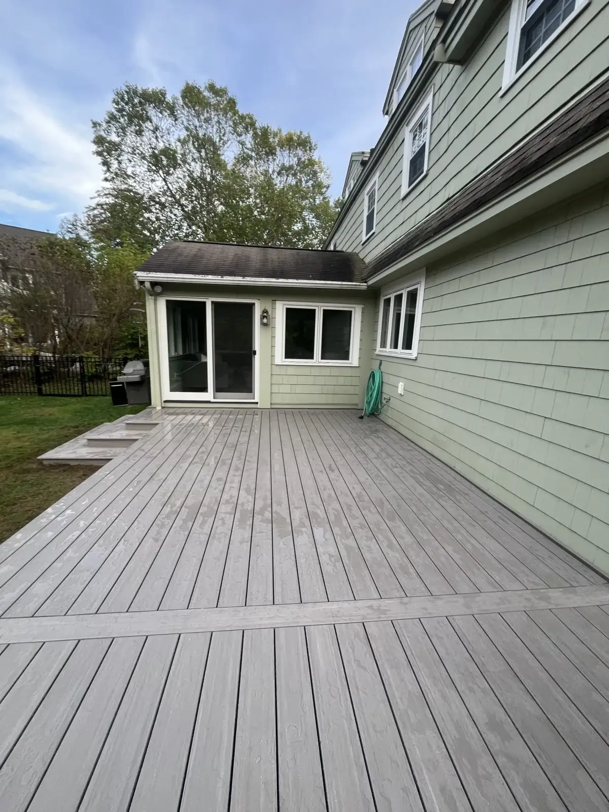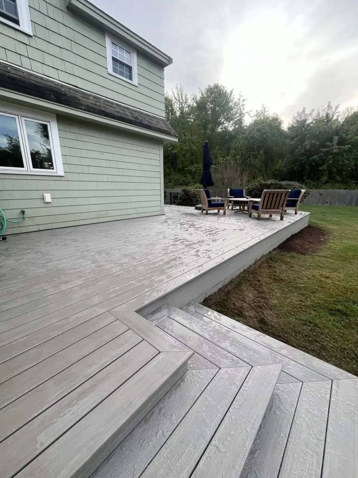 The deck surface was finished with Azek Coastline decking, and the entire frame was wrapped in matching 1×12 Azek fascia, double stacked for a bold, seamless look. By keeping the decking, fascia, stair risers, and structural elements all in the same color, the finished space feels cohesive, sleek, and intentionally designed. Two triple-depth staircases were added to improve access and create a natural flow into the backyard, making the deck both highly functional and visually striking.