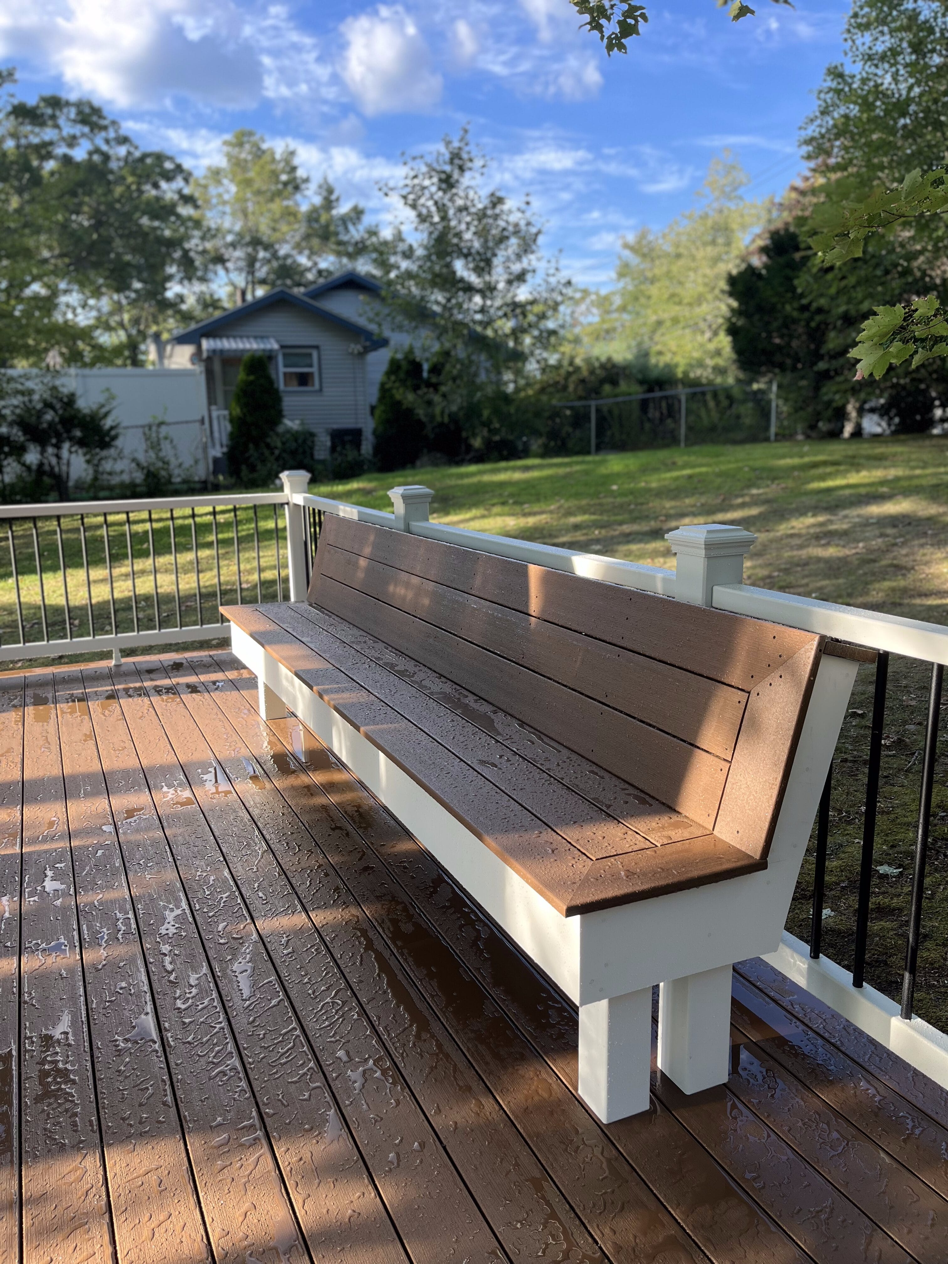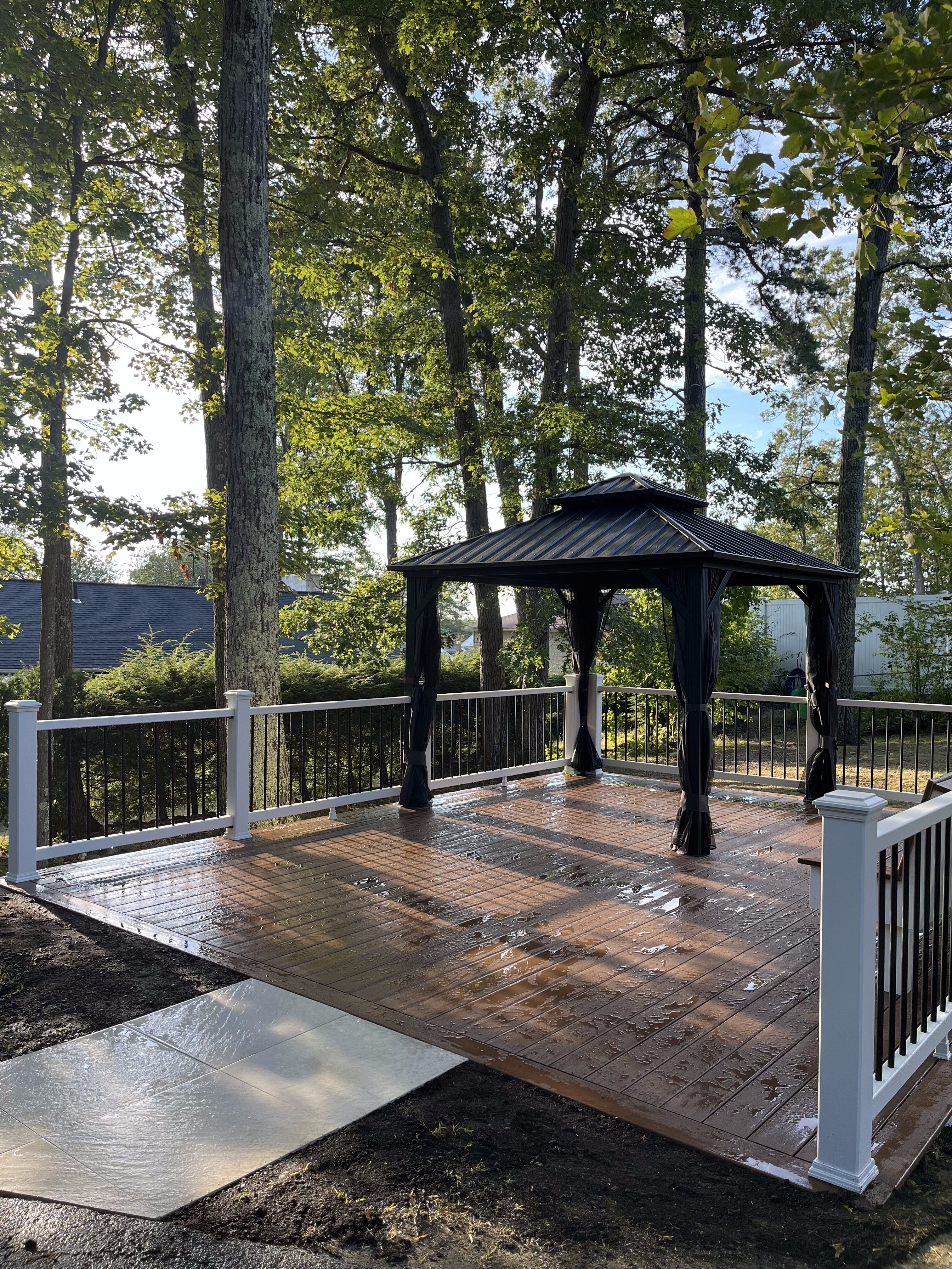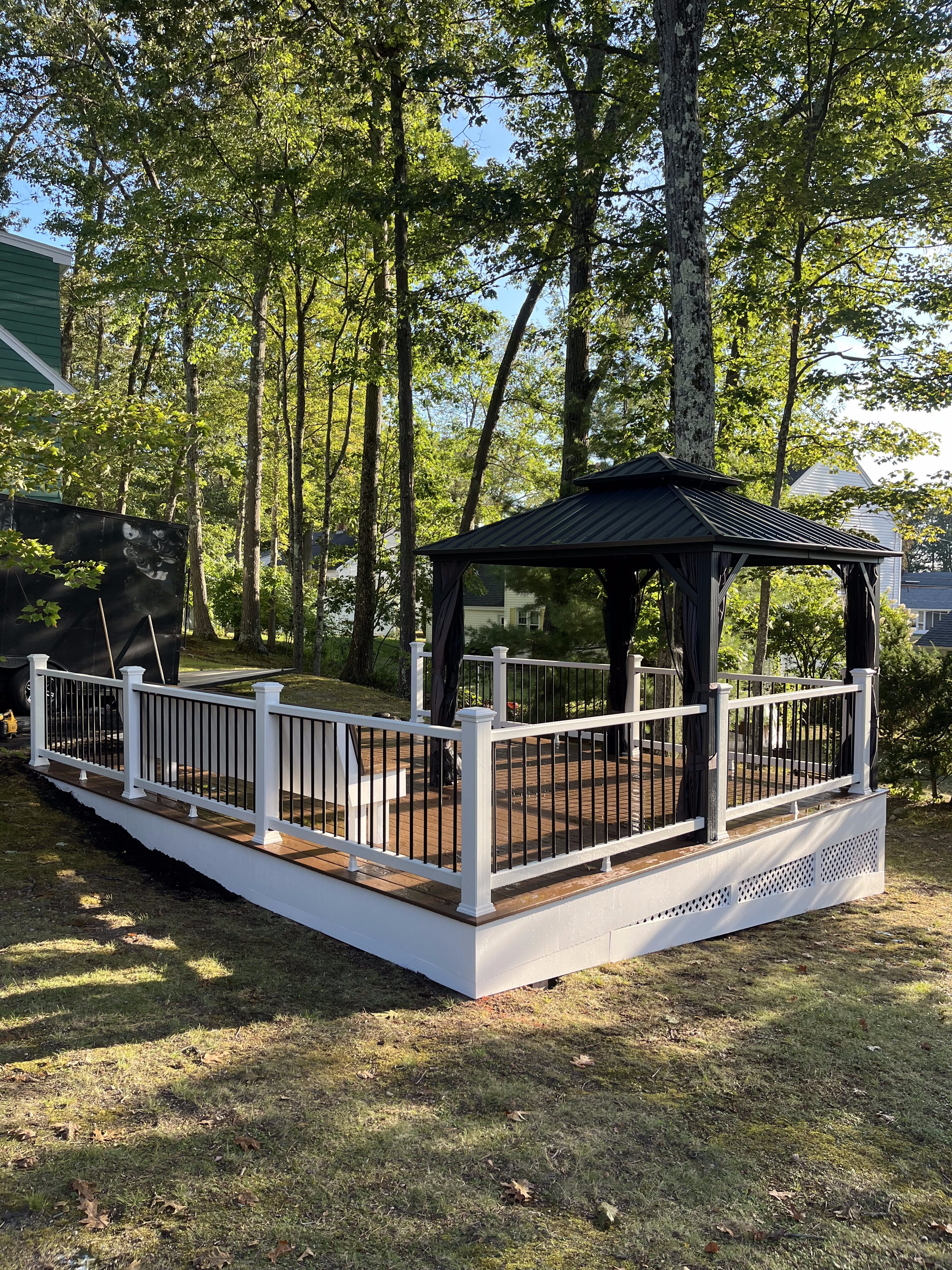 TimberTech Brown Oak decking was selected for its durability and natural wood-look finish, while Trex Select railing was installed to provide a simple, low-maintenance boundary that complements the overall design. A custom built-in sitting bench was added for functional, integrated seating, and a 12’x12’ screened gazebo was constructed to create a comfortable outdoor space free from insects. White PVC-wrapped latticework completed the structure, delivering a finished look with minimal long-term maintenance.